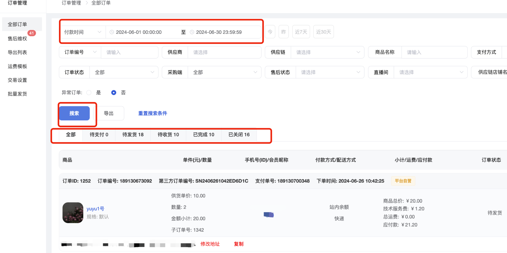 (3)供应链:支持筛选指定供应链的商品订单;