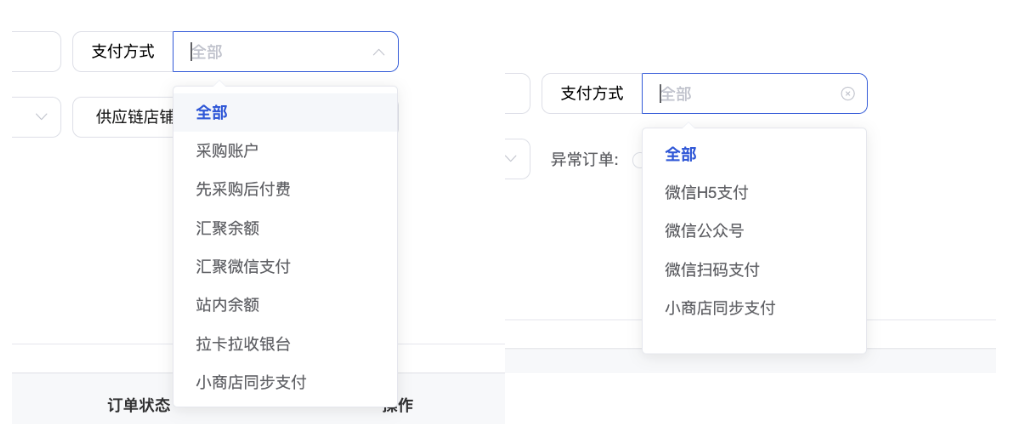 (2)供应商:支持筛选平台自营、全部供应商、指定供应商订单;