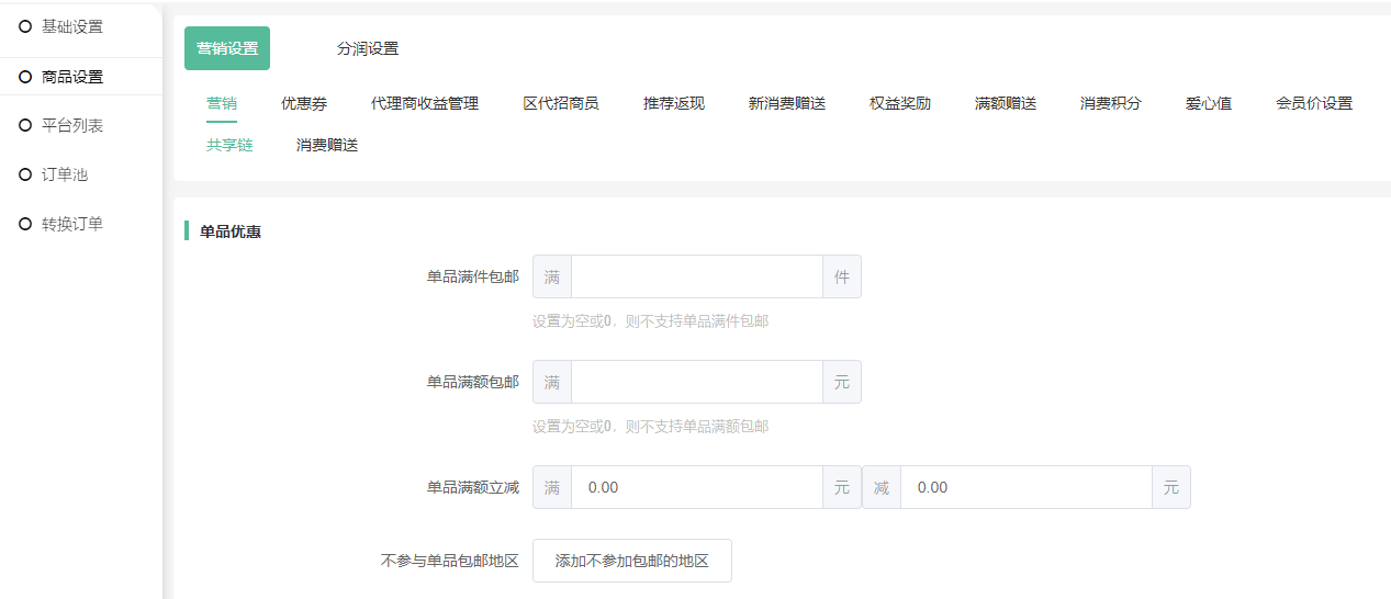 注意事项:因该功能的订单相当于虚拟商品订单(已完成状态),因此在营销设置和分润设置中,部分涉及实体订单、订单分润等的设置,是暂不支持执行的。