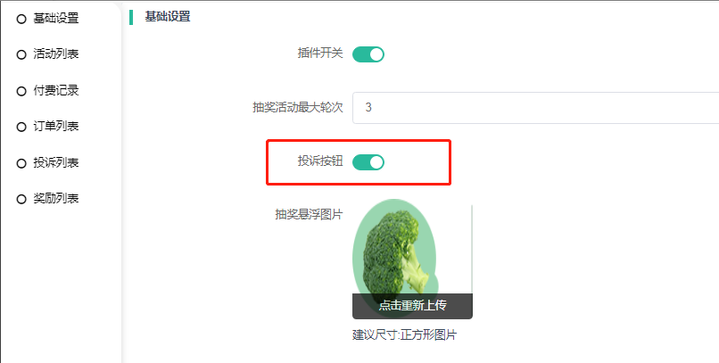 3, 是否开启投诉按钮:开启后前端活动详情页右上角显示投诉按钮,会员可进行投诉