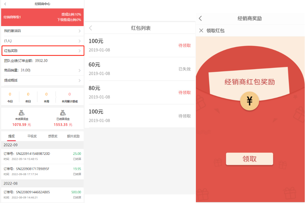 点击操作--可以查看经销商领取红包奖励详情:超过设置的失效时间内未领取则自动失效,退还给平台